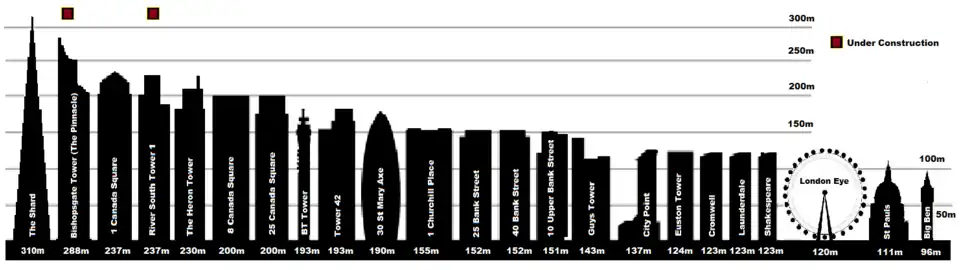 История высотных сооружений в Лондоне началась в 1098 году, когда была построена 27-метровая Белая башня — центральная башня лондонского Тауэра[2][3]. Первым сооружением, превысившим высоту в 100 метров, стал Старый собор Святого Павла. Построенный в 1310 году, собор имел в высоту 150 метров[4]. Он был самым высоким сооружением в мире до 1311 года, когда был построен Линкольнский собор[4]. В 1549 году центральный 160-метровый шпиль Линкольнского собора обрушился и Старый Кафедральный собор Св. Павла вновь стал самым высоким сооружением на земле[5]. Несмотря на то, что 4 июня 1561 года его шпиль был уничтожен ударом молнии, он всё равно оставался самым высоким сооружением в Лондоне[5], уступив титул самого высокого сооружения в мире Страсбургскому собору во Франции[4]. Старый Кафедральный собор Св. Павла был уничтожен во время Великого лондонского пожара в сентябре 1666 года, и самым высоким зданием в городе стал Саутваркский собор высотой 50 метров[6]. До строительства Собора Святого Павла в 1710 году в городе не было ни одного строения выше 100 метров[7]. Собор Святого Павла, имеющий в высоту 111 метров, оставался самым высоким зданием в Лондоне до 1962 года, когда был построен BT Tower.