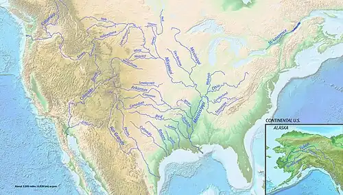 Благодаря своим многочисленным притокам, водосборный бассейн реки полностью или частично дренирует 32 (из 48 континентальных) штата США и две канадские провинции. |