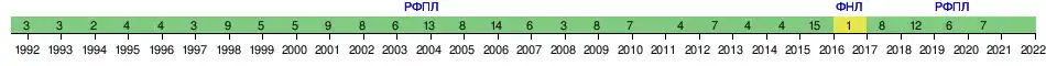 | 2012/13 | Премьер-лига | 30 | 14 | 6 | 10 | 41-34 | 48 | 5. Кураньи — 10 6. Кокорин — 10 | |