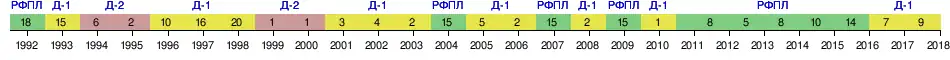 | 1992 | 1 | I этап (группа A) Высшей лиги | 9 из 10 | 18 | 3 | 6 | 9 | 19-30 | 12 |