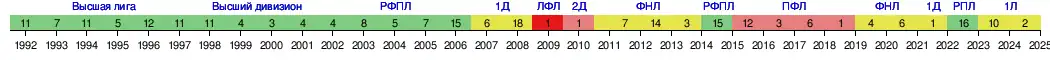 - ↑ Клуб не заявился в Первенство ФНЛ и сыграл в Первенстве ПФЛ.