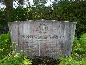 «В братскую могилу захоронено 13 воинов Советской армии, из них известных: Ст. лейтенант Тельмет Юхан Аугустович погиб 22.IX.1944 Лейтенант Лазуков Михаил Андреевич погиб 29.VII.1941 Рядовой Вийрак Арнольд Карлович погиб 22.IX.1944 Рядовой Вяйн Ральф Эрнстович погиб 22.IX.1944 Рядовой Раудаск Вольдемар Даниелович погиб 22.IX.1944 Рядовой Шевчук Николай Захарович погиб 20.IX.1944» |