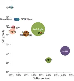 Хотя анализы сырой нефти оценивают различные химические свойства нефти, двумя наиболее важными свойствами, определяющими ценность нефти, являются ее плотность (измеряется как удельный вес API) и содержание серы (в % от массы). Сырая нефть считается «тяжелой», если она имеет длинные углеводородные цепи, или «лёгкой», если она имеет короткие углеводородные цепи: удельный вес API 34 или выше — «лёгкий», между 31-33 — «средний» и 30 или ниже — «тяжёлый». Сырая считается «сладкой», если в ней низкое содержание серы (<0,5% / вес), или «кислой», если она высокая (> 1,0% / вес). Как правило, чем выше удельный вес API (чем он «светлее»), тем ценнее сырая нефть.
