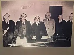 Слева направо: Ицхак Ольшан, рав Симха Асаф, Моше Змора, Пинхас Розен (министр юстиции), Менахем Дункельблюм, Шнеур-Залман Хешин