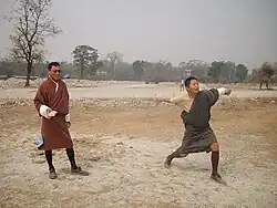 Национальным видом спорта в Бутане является стрельба из лука[1]. В большинстве деревень регулярно проводятся соревнования по этому виду спорта. Он отличается от олимпийских стандартов размещением мишеней и обстановкой. Две мишени располагают на расстоянии более 100 м друг от друга[1] и команды стреляют из одного конца поля в другой. Каждый член команды за раунд делает два выстрела. Традиционная стрельба из лука в Бутане является социальным явлением и соревнования проводятся между деревнями, городами и любительскими командами. Во время соревнований употребляют различные блюда и напитки, они также сопровождаются песнями и танцами[1].