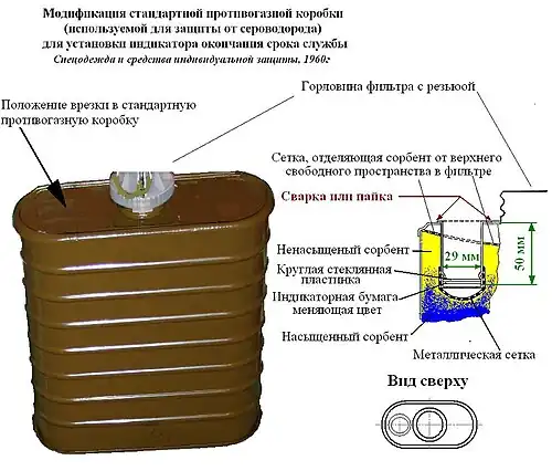 В указанном выше альбоме[33] и каталоге «Промышленные противогазы и респираторы»[17] описаны советские противогазные коробки марки «Г», предназначенные для защиты от ртути. Их срок службы ограничивался 100 часами использования (коробка без противоаэрозольного фильтра) или 60 часами использования (коробка с противоаэрозольным фильтром), после чего требовалась замена фильтра на новый.