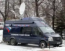 - Станции для связи в движении, устанавливаемые на транспортных средствах (автомобилях, поездах, судах, самолётах). При движении положение антенны относительно спутника непрерывно меняется и требуется её удержание (стабилизация) в нужном направлении. Для удержания направления на спутник на движущихся объектах используются два метода. Первый — непрерывное определение направления, в котором смещается спутник относительно антенны, путём постоянного сканирования (отклонения диаграммы направленности) в узком секторе, не приводящем к существенному ухудшению сигнала. Второй — удержание положения антенны с помощью гироскопов и датчиков ускорений[64].