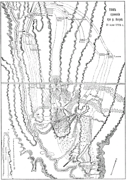Русский полководец уже в 1770 г. выработал правила построения войск для нападения на турецко-татарскую армию. По замыслу Румянцева, каждая дивизия («корпус») строилась в каре, в котором «боковые фасы половину фрунтового фаса имели»[19]. Углы каре предписывалось занять гренадерам ближайших к ним полков. Несколько каре образовывали боевую линию, а на флангах располагались егерские каре. Атаку надлежало производить скорым шагом («поспешно») под звуки музыки[20].