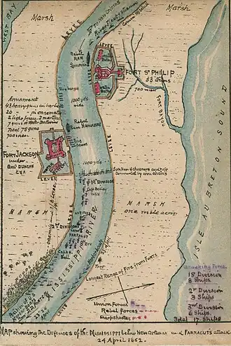 Основную ставку в обороне южане делали на береговые форты — форт Джексон на левом берегу реки и форт Сен-Филип на правом. Первый из них был каменным фортом в форме пятиконечной звезды, построенным в 1830-х и был вооружён 74 орудиями. Второй был неправильной формы земляным фортом, построенным напротив форта Джексон, и был вооружён 52 орудиями. Перед фортами, южане установили в реке заграждение из скреплённых цепями бревен, которое должно было затруднить прорыв неприятеля и задержать его корабли под перекрёстным огнём с фортов. По мнению командования южан, эта система обороны являлась почти непреодолимой. В действительности оборона Нового Орлеана имела ряд слабых мест.