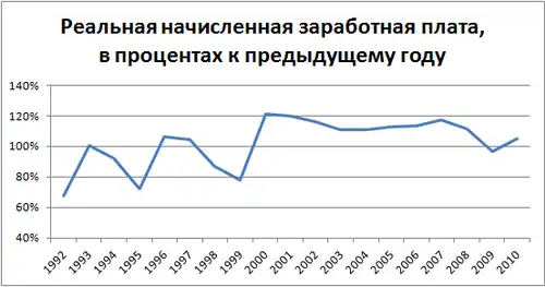 - ↑ Реальная среднемесячная начисленная заработная плата, процент. Дата обращения: 26 декабря 2013. Архивировано 27 декабря 2013 года.