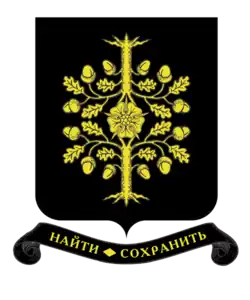 Геральдические описание герба гласит: «В чёрном поле щита два золотых дуба (один из которых опрокинут) с единой кроной, процветшей в сердце золотой же розой. Под щитом на чёрной ленте золотой литерой девиз: „Найти. Сохранить“»[5].