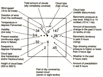 Хотя станционная модель разработана для карт погоды на поверхности, она иногда используется и для погоды на других высотах. В станционную модель входят значения таких данных, как атмосферное давление, температура воздуха, направление и скорость ветра, облачный покров и режим осадков[1].