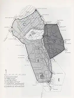 Территория внутри средневековых городских укреплений разделена на несколько исторических подрайонов, в которых четко прослеживается история возникновения старого имперского города[3], подробно представленная в статье «Городские укрепления Аугсбурга», раздел «Обзор» ; В центре находится так называемый Епископский город с Аугсбургским собором. На севере находится Нижний город (то есть город ниже по течению ), который был окружен стеной только во время второго расширения города. Оба расположены на месте бывшего римского города , простиравшегося еще дальше на север. К югу от Епископального города находится Верхний город (т.е. город вверх по течению ). Это первое расширение города XII и XIII веков также известно как гражданский город. Он не только расположен на высокой террасе Аугсбурга, но и простирается до низменности Леха с Лехфиртелем. В XIV веке Якоберфорштадт был включен в состав восточной части, которая расположена между внутренними и внешними городскими рвами и полностью находится в низменности Леха.