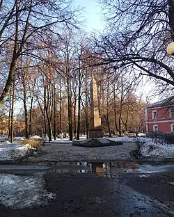 Обелиск был сооружён специалистами реставрационной мастерской и открыт в день 40-летия Октябрьской революции (7 ноября 1957 года). На двойном кубическом пьедестале вознёсся четырёхгранный обелиск с пирамидальным завершением. На гранях пьедестала выбиты имена шести красногвардейцев, погибших в 1918 году (Зубков, Ершов, Таманский, Корчагин, Рябинов, Конышев (Канышев)). Автором памятника стал Николай Иванович Сидоркин (1933—1987), будущий главный архитектор города Рязани (1967—1982).