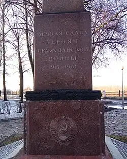 На лицевой стороне стелы выгравирована надпись: «Вечная слава героям гражданской войны 1917—1918», с левого бока высечено «Красногвардейцы: Таманский И. П., Конышев И. (исправлено, ранее была надпись „Канышев И.“), Рябинов А. и другие павшие в борьбе с контрреволюцией 1918 года», с правого бока высечено: «Красногвардейцы Ершов А. И., Корчагин В., Зубков и другие павшие в борьбе с контрреволюцией 1918 года».