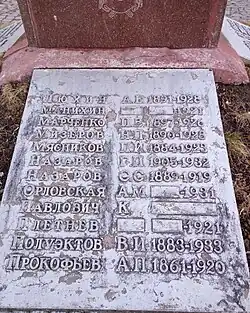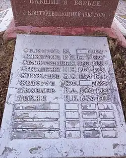 - 1922 год — умерший от туберкулёза председатель контрольной комиссии губкома РКП(б) Сычев Илья Ионович (50 лет). На табличке у стелы не указан. Сохранилась могила.