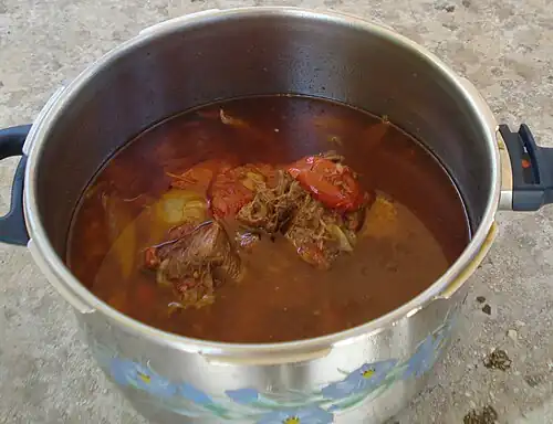 Не ранее второй половины XIX века в рецепт был включён томатный соус, которым вместе с маринадом из вина начали заливать мясо перед отправкой его на огонь.