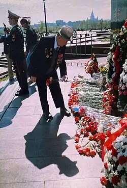 Родион Михайлович Суворов возлагает цветы к Монументу Победы на Поклонной горе, 9 мая 2005 года. Свидетельство № 1327 пилота ГВФ второго класса Суворова Р.М.