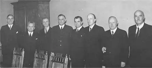 Слева направо: Хенрик Рамзай, Тико Рейникка, Антти Кукконен, Эдвин Линкомис, Дж. В. Рангелл, Ристо Рюти, Вяйно Таннер и Т. М. Кивимяки