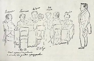«Вдруг я увидел себя в ярко освещённой комнате, перед столом, покрытым красным сукном, около которого сидели все члены нашего Комитета в мундирах и регалиях. Президентское место занимал генерал Татищев, по левую руку от него находились князь А. Н. Голицын, генералы Дибич, Чернышёв, Бенкендорф; по правую — великий князь Михаил Павлович, с.-петербургский губернатор Кутузов, генералы Левашев, Потапов, флигель-адъютант Адлерберг…».