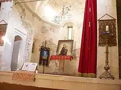 Интерьер храма очень скромный. На основном, алтарном перекрытии изображён Христос, сидящий на троне среди зигзагообразных линий — небесных молний. У него угадываются фигуры Богоматери, Иоанна Крестителя. По краям композиций символы евангелистов — ангел, голубь, лев и бык. Конечно, от росписи сейчас осталось не больше половины, много изображений на фресках угадываются с трудом.