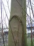 - роза[2] образуется у старого раневого пятна грубокорых пород;