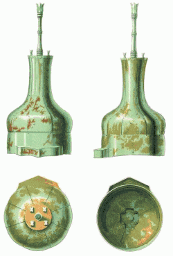 Тулья сфероцилиндрического шлема склёпывалась из 6—8 пластин. Снизу стягивалась обручем, в нём же делались отверстия для крепления бармицы. Сверху эти пластины загибались и приклёпывались к плоскому круглому навершию. На нём часто закреплялись другие навершия: чаще всего высокая трубка в центре, а по бокам — несколько небольших втулок — для плюмажей. Спереди на обруч крепился козырёк, нередко — «коробчатый» — он состоял из трёх пластин, одна из которых крепилась вертикально, а две другие — сверху и снизу к ней. Полная высота такого шлема могла быть 50 см, но чаще была порядка 30.