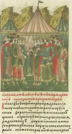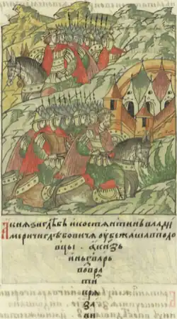 - ↑ Славянская энциклопедия. Киевская Русь — Московия: в 2 т. / Автор-составитель В. В. Богуславский. — М.: Олма-пресс, 2001. — Т. 1: А—М. — С. 280. — 784 с. — 5000 экз. — ISBN 5-224-02249-5. со ссылкой на Воскресенскую летопись