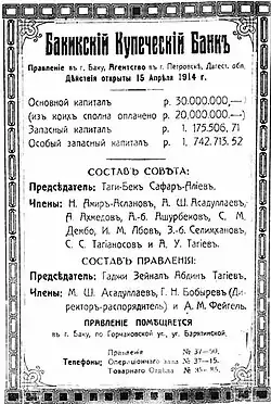 В 1914 году с участием Г. З. Тагиева и М. Нагиева был создан «Купеческий банк» (основной капитал 3 млн рублей)[55].