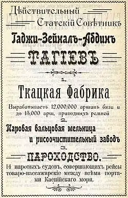В 1914 году Тагиев приобрёл основанную в 1897 году крупную бумаго-прядильную и ткацкую фабрику в Петровске[46].