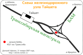 - на северо-восток начинается Байкало-Амурская магистраль (БАМ) (первый километр БАМа находится в Тайшете);