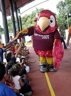 | Guaky | Гуаки | Красный ара (Ara macao) — один из символов Венесуэлы, внесённый в Красную книгу. Попугай одет в гранатовую форму сборной Венесуэлы. Нижняя часть крыльев и хвост Гуаки раскрашены в цвета флага Венесуэлы с восемью звёздами. | [1] | |