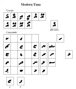 Тана, подобно арабскому письму, записывается справа налево. Гласные обозначаются при помощи диакритических знаков, происходящих из арабского письма. Каждая буква должна иметь гласный или знак сукун, обозначающий отсутствие гласного. Единственным исключением из этого правила является буква nūnu, которая без диакритического знака обозначает преназализацию последующего взрывного согласного.