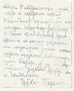 "Реляция о бое 10-й и 11-ых рот при д. Горожанка Вельма представил. Нахожу необходимым добавить что, как Штабс-Капитан Тарапыгин, командир 10-ой роты, так Подпоручик Покровский вели себя доблестно, подавая пример нижним чинам. Штабс-Капитан Тарапыгин ранен в голову и лишился правого глаза, Поручик Покровский ранен в плечо с раздроблением ключицы. Атака дала блестящие результаты - взяли пулеметы."