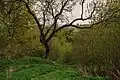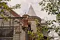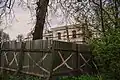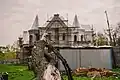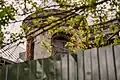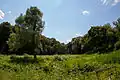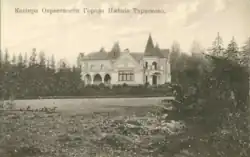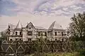Главный усадебный дом — редкий образец раннего модерна с элементами средневековой архитектуры. Вокруг дома тесно раскинулись деревья.