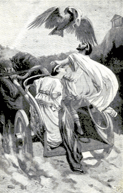 Лукумон со всем домом и богатствами отправился в Рим. Когда он на своей колеснице уже подъезжал к Яникулу, орёл закружился над головой будущего царя, схватил его шлем, поднял в воздух, а потом опять возложил его на голову. Танаквиль увидела в этом доброе предзнаменование и сказала, что её муж станет царём.