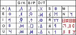 На письме различались 5 гласных: «a», «e», «i», «o», «u»; отмечено присутствие дифтонгов /ai/ и /oi/, а также использование знака «u» в значении полугласного /w/. Как и в иберском языке, различались знаки для трёх серий смычных: велярных, дентальных и лабиальных; при этом хотя их принято обозначать в транскрипции глухими звуками «k», «t» и «p», достоверно о них неизвестно, были ли они глухими или звонкими. Аналогично, для звука, который передаётся в транскрипции как «b», речь не обязательно идёт о звонком, он мог быть и глухим (таким образом, одна и та же комбинация букв может быть транскрибирована и как «paare», и как «baare»). Хорошо задокументировано наличие двух согласных «l» и «n», а также двух разновидностей «s» (одна из них, по-видимому, была палатализована) и двух различных «r» (различие между ними непонятно). Отмечается, что знак «m» используется только перед «u», а возможный аспирант типа «h» встречается только перед «a».