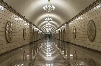 Колонная трехсводчатая станция глубокого заложения (глубина 30 м) с междупутьем 18,1 м. Состоит из трех залов — центрального и двух боковых, которые образуют общую островную платформу шириной 15,2 м и длиной 104 м. Спуск-подъём на станцию по эскалаторам (4 ленты) высотой подъёма 27,0 м, длиной 54,0 м.