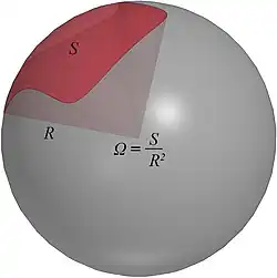 Телесный угол измеряется отношением площади той части сферы с центром в вершине угла, которая вырезается этим телесным углом, к квадрату радиуса сферы: