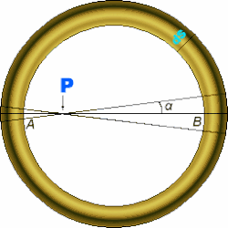 Вторую часть теоремы удобнее доказать, вычисляя гравитационный потенциал в точке вне сферы на расстоянии от её центра. Сначала можно рассмотреть пояс на сфере, который ограничен углами от до между направлениями от центра сферы к точке на ней и направлением на точку . Площадь поверхности такого слоя равняется , поверхностную плотность можно обозначить как . Кроме того, его точки находятся на одном расстоянии от , поскольку пояс симметричен относительно оси, соединяющей центр сферы и точку . Тогда потенциал , который создаётся поясом, выражается как[1][4]: