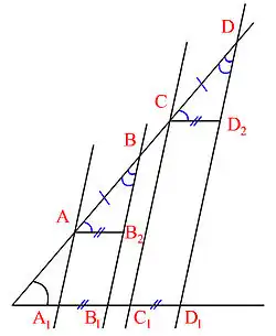 Если на одной из двух прямых отложить последовательно несколько равных между собой отрезков и через их концы провести параллельные прямые, пересекающие вторую прямую, то они отсекут на второй прямой равные между собой отрезки.