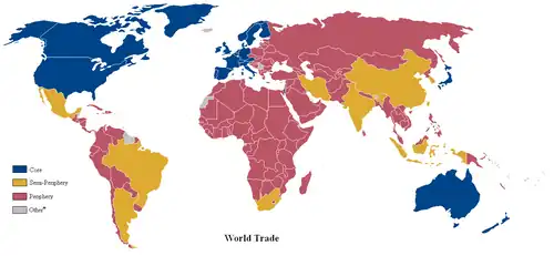 Мировая система разделена на три уровня государств: ядро, периферию и страны полупериферии. Определяющие характеристики этих уровней менялись по мере того, как Валлерстайн применял новые идеи. Если в его ранних работах разница между этими уровнями заключается в силе государственных систем в каждой стране[85], то позже все государства это часть межгосударственной системы, которая существует для того, чтобы разделить мир на области, различающиеся по степени, в которой они получают выгоду или вред от неравного обмена[86].