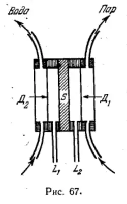 Пластина S из пористого вещества (вместо отверстия) укреплена между двумя эбонитовыми кольцами, закрытыми металлическими дисками Д1 и Д2 (рис. 67) Исследуемый газ (воздух) изолирован между этими дисками и пористой пластиной. Диск Д2 охлаждается проточной водой, а диск Д1 нагревается паром, таким образом создаётся разница температур между объёмами газа по обе стороны от пластины. При помощи манометров, присоединённых с помощью трубок L1 и L2, измеряются давления p1 и p2.