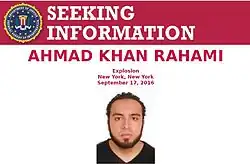 17 сентября 2016 года прозвучал взрыв в Нью-Йорке и в штате Нью-Джерси с разницей в несколько часов. В Нью-Йорке число пострадавших составило 29, а в Нью-Джерси таковых не было[1]. 19 сентября по делу о взрыве задержан выходец из Афганистана Ахмад Хан Рахами[2][3], а 13 февраля 2018 года он был приговорен к обязательному пожизненному заключению без права досрочного освобождения.