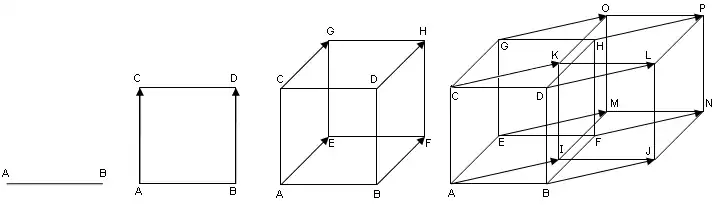 В одномерном «пространстве» — на линии — выделим отрезок АВ длиной L. На двумерной плоскости на расстоянии L от АВ нарисуем параллельный ему отрезок DC и соединим их концы. Получится квадрат CDBA. Повторив эту операцию с плоскостью, получим трёхмерный куб CDBAEGHF. А сдвинув куб в четвёртом измерении (перпендикулярно первым трём) на расстояние L, мы получим гиперкуб CDBAGHFEKLJIOPNM.