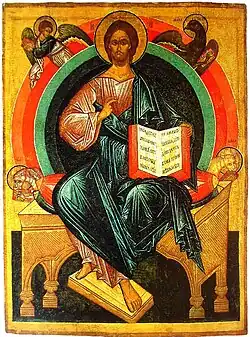 В системе росписи православного храма тетраморфы могли изображаться в парусах купола вместо собственно евангелистов, либо же вместе с ними[35]. В иконе «Единородный Сыне» Спас держит в руке небольшой тетраморф.