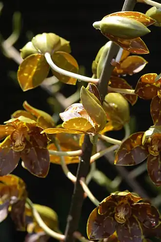 Каждая из его кистей (ветвей) может вырасти до высоты 3 метров, имея до восьмидесяти цветков, каждый размером в 10 см. Цветы имеют осмофоры и испускают химический аромат, чтобы привлечь опылителей. Цветет такая орхидея один раз в два-четыре года, оставаясь в цвету до двух месяцев.