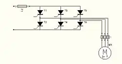 Тиристорный преобразователь (инвертор), изображённый на рисунке 2, выполнен на шести тиристорах по схеме Ларионова. В зависимости от вида включения обмоток тягового двигателя (звездой или треугольником), преобразователь по схеме Ларионова имеет существенно разные характеристики. Некоторые характеристики («живучесть» при выходе из строя нескольких тиристоров) преобразователей на двенадцати тиристорах, выполненных по схеме «три параллельных моста» лучше, чем у преобразователей по схеме Ларионова.