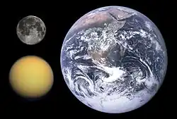 При сопоставимых размерах с Меркурием и Ганимедом, Титан обладает обширной атмосферой, толщиной более 400 км[25][26]. По современным оценкам атмосфера Титана состоит на 95 % из азота и 4 % метана, атмосферное давление у поверхности в 1,5 раза больше чем у Земли[27][28]. Наличие метана в атмосфере приводит к процессам фотолиза в верхних слоях и образованию нескольких слоёв углеводородного «смога», из-за чего Титан является единственным спутником в Солнечной системе, поверхность которого невозможно наблюдать в оптическом диапазоне.