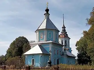 Каменная церковь Иконы Божией Матери Тихвинская типа восьмерик на четверике с трапезной и шатровой колокольней, образец провинциального барокко. Выстроена вместо деревянного храма во имя Димитрия Селунского в 1758 году на средства помещиц — сестёр Е. А. Киреевской, А. А. Квашниной и Ф. А. Муравьёвой. Главный престол Тихвинский, в трапезной — Дмитриевский придел (Захарие-Елизаветинский упразднён в 1883 году).